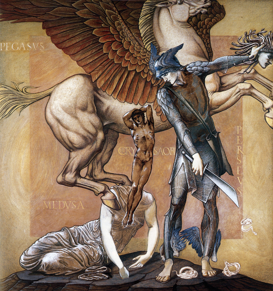 Persée, muni d’un bouclier dont l’intérieur lui servait de miroir pour éviter d’être pétrifié par le regard de Méduse, et d’une épée offerte par Hermès, parvint à lui trancher la tête. Du sang jaillissant de son cou naquirent Chrysaor et Pégase, tous deux engendrés par Poséidon. Persée offrit ensuite la tête de Méduse, appelée le Gorgonéion (Γοργόνειον / Gorgóneion), à Athéna, qui l’intégra à son égide, conférant à son bouclier le pouvoir de pétrifier ses adversaires. Selon certaines versions du mythe, le sang prélevé sur le côté droit d’une Gorgone pouvait redonner la vie à un mort, tandis que celui issu du côté gauche était un poison foudroyant.