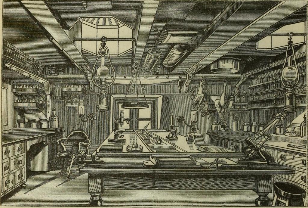 Figure 2 Le laboratoire des naturalistes à bord du Challenger, gravure extraite de The Cruise of H.M.S. Challenger (1877). Un espace dédié à l’analyse des échantillons prélevés dans les grands fonds.