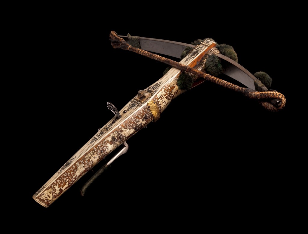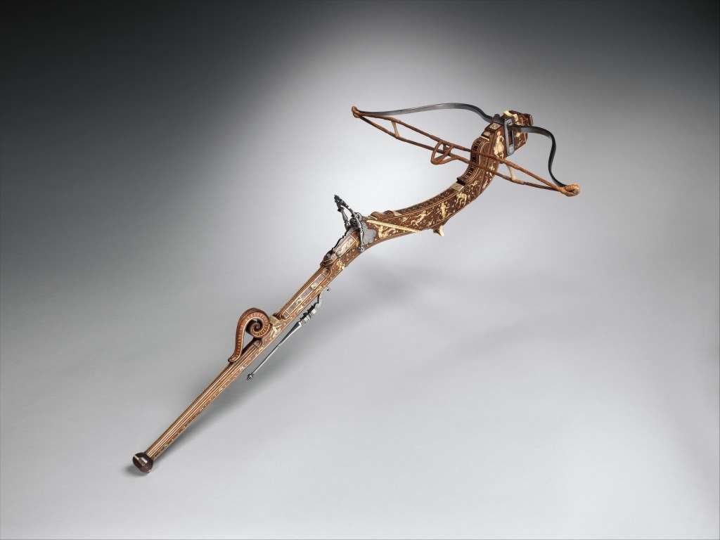 L’arbalète trouve ses premières formes dans la Chine ancienne, aux alentours du Ve siècle av. J.-C. Des découvertes archéologiques dans la tombe du roi de Chu montrent des mécanismes de détente sophistiqués. Elle apparaît en Grèce sous une forme appelée gastraphetes (littéralement « ventre-arme »), utilisée par les ingénieurs grecs pour les sièges.