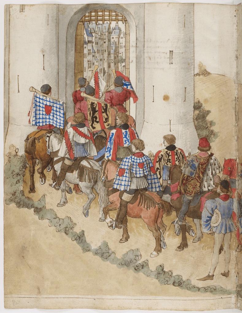 - L’entrée en ville : les chevaliers arrivent dans un ordre précis, suivi des juges. Ceux-ci logent dans un cloître où sont exposés les emblèmes et les bannières.