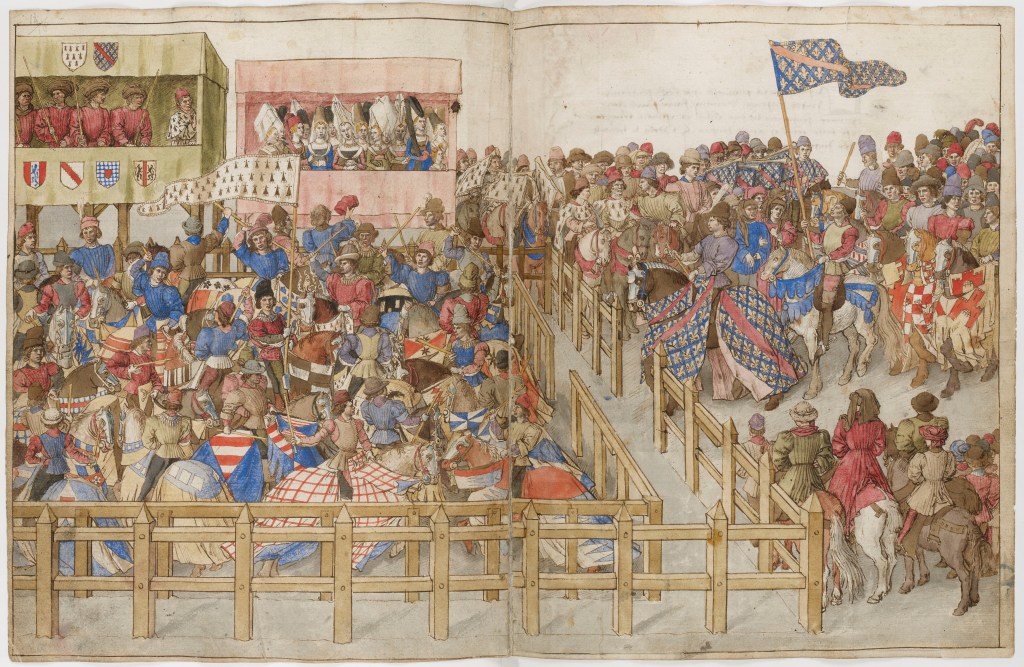 Le tournoi imaginé par René oppose deux seigneurs fictifs : le duc de Bretagne, appelé appelant, et le duc de Bourbon, le défendant. L’appelant lance le défi, et le défendant l’accepte. Ce schéma souligne que le tournoi n’est pas seulement un affrontement physique : c’est un rituel social, où l’honneur et la loyauté sont au cœur de l’événement.