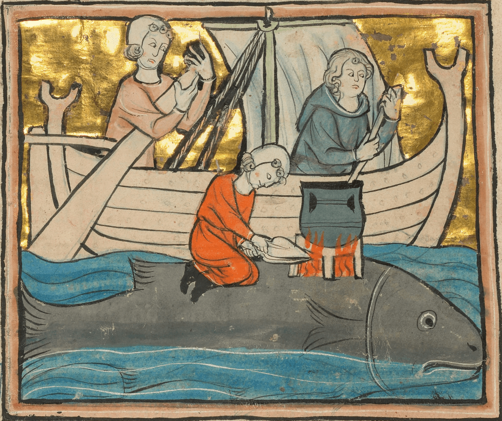Saint Brendan et sa baleine méritent ici une mention particulière. Dans la Navigatio Sancti Brendani (IXe siècle), le moine irlandais et ses compagnons débarquent sur ce qu’ils prennent pour une île, y célèbrent même la messe de Pâques, avant que l’île ne commence à se mouvoir. La créature — nommée Iasconius — n’est pas ici malveillante : elle est simplement immense, indifférente, et sacrée à sa manière. Le récit de Brendan christianise le motif : au lieu d’engloutir les marins, la baleine les laisse partir. La Providence est à l’œuvre.
