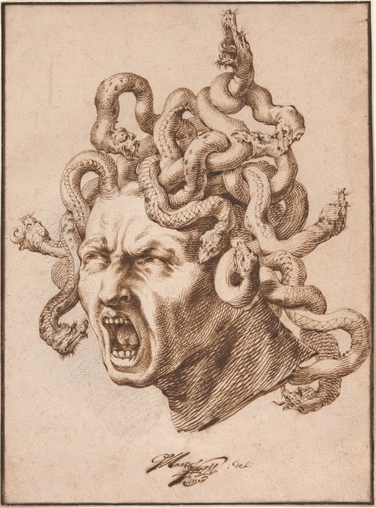 Sa fin survient lorsque Persée, armé d’un bouclier poli offert par Athéna, d’une épée d’Hermès et des sandales ailées d’Hermès, parvient à l’approcher sans croiser son regard. Il tranche sa tête d’un coup net, libérant du sang de sa plaie Pégase, le cheval ailé, et Chrysaor, le guerrier d’or. Même décapitée, la tête de Méduse conserve son pouvoir pétrifiant, et Persée l’utilisera pour terrasser ses ennemis avant de l’offrir à Athéna, qui l’apposera sur son égide comme un symbole de puissance et de terreur.